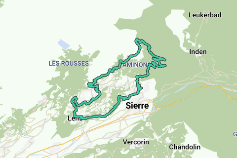 Vertrek is bij het Moubra-meer, daarna leidt de route richting Arnouva, langs de meren Grenon en Chermignon. De tour gaat verder naar Marolires en dan naar Courtavey. Vervolgens bereikt u Ploumachit en dan Colombire met zijn Alpage-museum en verder langs de "bisse du Tsittorent" aan de Alpage du Scex. Een indrukwekkend alpien panorama, een ontspannen sfeer en de vele typische restaurants bieden u onvergetelijke momenten. Voordat u naar beneden gaat, heeft u nog de laatste inspanning voor de boeg om Tièche te bereiken. Daar moet u een kleine brug oversteken, voordat u ongeveer 15 km naar beneden rijdt door Cordona, Planige, Venthône, Tovachir naar Chermignon-d'en-Bas. U bereikt dan Lens, een zeer mooi dorp. Hier kunt u het Kunstmuseum Fondation Pierre Arnaud en het Historisch Museum Grand-Lens bezoeken. De terugkeer naar Crans-Montana verloopt via de bovenloop van Icogne, het westelijkste dorp in Crans-Montana, of u kunt door Chermignon-d'en-Haut rijden. Van de "Mayens" vereist de klim naar het resort enige inspanning, voordat het terugkeert naar het startpunt bij het Moubra-meer. U kunt zich bij het Moubra-meer aan het strand ontspannen of een van de verschillende activiteiten kiezen die daar worden aangeboden.