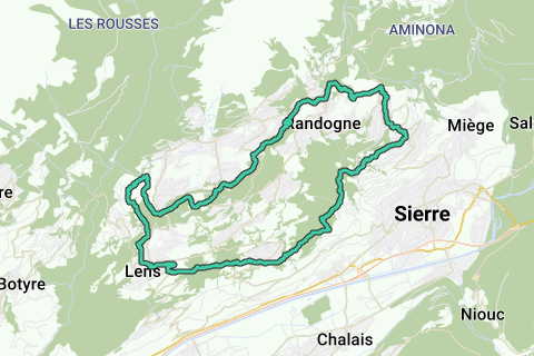 Vertrek is vanaf het Moubra-meer. De route leidt u vervolgens in de richting van de dorpen Randogne en Mollens, om boven Venthône aan te komen. Als u de reis in Darnona wilt onderbreken, kunt u met de fiets in de kabelbaan terug naar het resort gaan. Verder gaat het terug naar het westen, richting Chermignon-d'en-Bas, dan naar Lens met een klim op het Chemin des Bouillettes naar de voet van de Christus-Koning heuvel, die u verlaat om het Louché-meer te bereiken. De terugkeer naar Crans-Montana verloopt via de bovenloop van Icogne, het meest westelijke dorp in Crans-Montana. Van de "Mayens" vereist de klim naar het resort enige inspanning. U kunt uitrusten bij het Miriouges-meer in het hart van het bos, voordat u terugkeert naar Moubra. Deze route verenigt alle ingrediënten van een echte fietstocht: technische afdalingen, verschillende soorten paden... alles in een zeer gevarieerde omgeving. Deze excursie kan ofwel in één keer (23 km) of in etappes worden uitgevoerd.