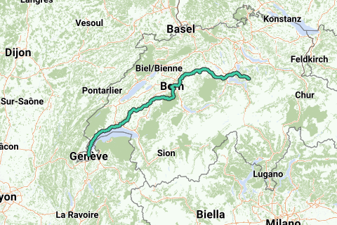 Pelgrimsweg voor wandelingen tussen Schwyz en Genève. De volgende steden liggen op de route: Schwyz, Luzern, Burgdorf, Bern, Fribourg, Lausanne en Genève.