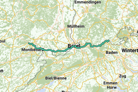 Pelgrimroute voor mountainbikes tussen Waldschut en Couthenans. De volgende steden liggen op de route: Waldshut, Bazel, Héricourt en Couthenans.