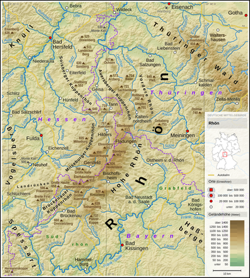 Het gebergte ligt op het grondgebied van drie deelstaten en er wordt op grond daarvan dan ook onderscheid gemaakt tussen de Hessische Rhön, de Beierse Rhön en de Thüringer Rhön. De grens tussen West- en Oost-Duitsland liep er dwars doorheen.