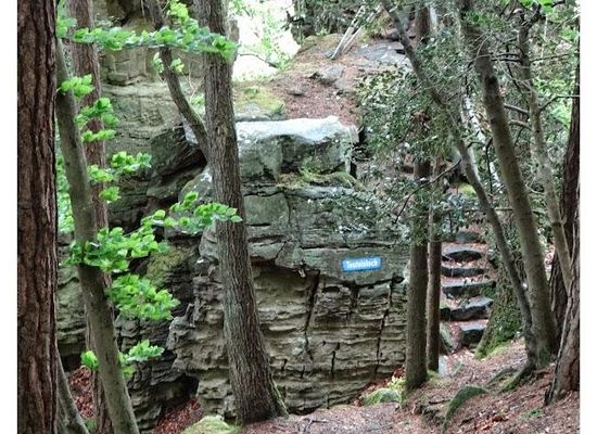 In geen geval mag u het uitzicht missen vanaf de uitkijkrots boven het Teufelsloch, die via een steil pad te bereiken is. Vanaf hier kijk je ver over het dal met zijn beboste rotshellingen en Bollendorf op de rechteroever van de Sauer.