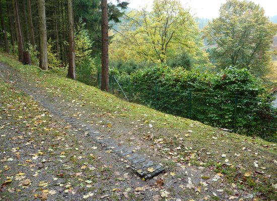 Een afgebroken "pantserketting' van een Sherman tank, die het terugtrekkende 707e tank bataljon moest achterlaten, net als veel andere voertuigen. Verderop zijn nog pantsersporen te zien in de steenachtige bodem. Volg de route 66 ( wandelroute) en je krijgt een bijzonder uitzicht op het Kall-dal en Vossenack, waar het museum is gevestigd.