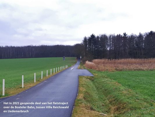 In 2021 is het vrijliggende geasfalteerde fietspad tussen Uedemerbruch en Villa Reichswald gereedgekomen. Het fietspad maakt onderdeel uit van de Boxteler Bahn, een voormalige spoorlijn die tussen Xanten en Uedem is omgezet in fietspad. Het gedeelte tussen tussen Uedemerbruch en Villa Reichswald volgt echter niet het oorspronkelijke spoortraject. Fiets je in de richting van Uedemerbruch naar Villa Reichswald dan is dat in klimmende richting waarbij het kort nog steil wordt (tot 10%).