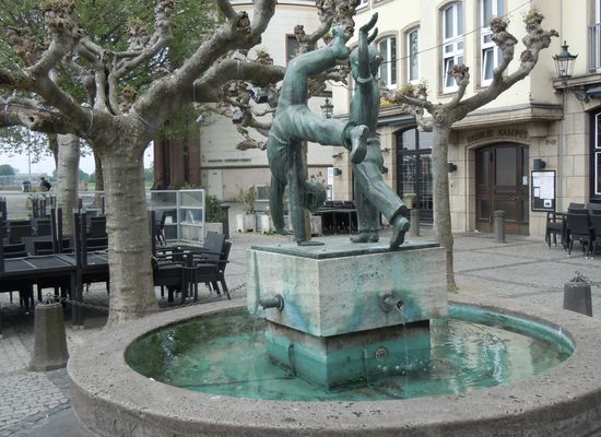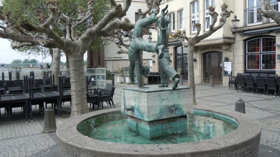 Het radslagsymboom zie je overal, op souvenirs, op snoep, op de prachtige deurklopper van de Sint Hubertuskerk, op putdeksels en op een mooi standbeeld op de Burgplatz. Hoewel er verschillende legendes zijn die de oorsprong verklaren, is de slag om Worringen wel de meest bekende. Düsseldorf was in 1135 louter een simpel boerendorpje maar in 1288 verwierf het stadsrechten na de Slag bij Worringen. Burgers en kinderen waren zo verrukt dat ze van vreugde radslagen gingen maken.