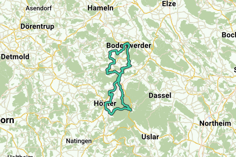 Een bijzonder afwisselende route is dit die start met een afdaling naar het dal van de Wezer via de L549. Je fietst langs de Wezer naar Höxter (bezoek ook het aardige centrum waar enkele standbeelden van levensechte personen staan) en vervolgens langs het UNESCO werelderfgoed Kloster Corvey. Je blijft langs de Wezer fietsen. Uiteindelijk kom je op het fietspad langs een Bundesstraße uit dat je 3,5 km volgt tot in Heinsen (een alternatief is een kort stuk gravelweg nemen om dan over geasfalteerde wirtschaftswegen naar Heinsen te fietsen (door het fietsroutenetwerk te volgen)). In Heinsen fiets je even langs de Wezer om dan weg te klimmen naar de top van de Wilmeröder Berg over wirtschaftwegen, met prachtige uitzichten over het Weserbergland.