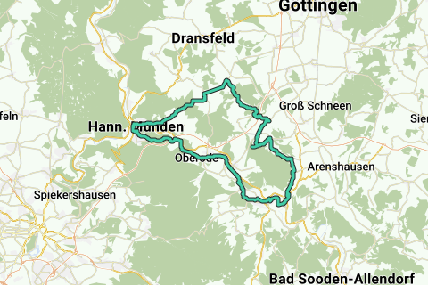 Vanuit Hannoversch Münden gaat het al snel omhoog naar de Kattenbühl, om daarna af te dalen naar het dal van de Werra. Je zou deze klim over kunnen slaan door direct vanuit Hannoversch Münden het gravelfietspad langs de Werra te volgen.