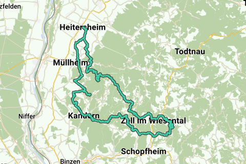 Je fietst vervolgens naar Wieslet, en dan volgt de klim die bekend staat als Lehnacker (je beklimt de zuidoostelijke opgang, met prachtige landschappen en nauwelijks verkeer). Nog steeds over rustige wegen fiets je naar Endenburg, om dan af te dalen naar Kandern, en dat gaat in het tweede deel van de afdaling over Landesstraße (waar wat meer verkeer zal rijden). Kandern is een heel aardige plaatsje en heeft vele restaurants waar je je hart op kunt halen aan één van de vele Schwarzwald specialiteiten (Schwarzwalder Kirchtorte, Flammkuchen, Spätzle).
