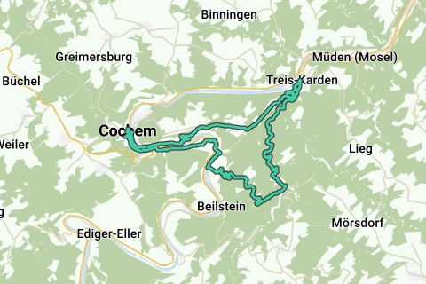 Vanuit Cochem fiets je langs de Moezel tot aan klooster Ebernach. Vervolgens fiets je langs bosrand en door wijngaarden naar wijndorp Ernst. Van Ernst tot Bruttig-Fankel fiets je weer direct langs de Moezel. Dan klim je de Hunsrück in (een lange beklimming over een rustige weg die breed is). Vervolgens daal je af, het tweede deel van de afdaling gaat vals plat omlaag door het mooie Flaumbachtal tot in Treis Karden. Vanuit Treis-Karden klim je weer weg uit het Moezeldal om naar Valwigerberg te fietsen. En dan volgt de steile afdaling (15%) vanuit Valwigerberg met prachtige vergezichten op de Moezel. De korte rit eindigt nog met een stukje langs de Moezel tussen Valwig en Cond.