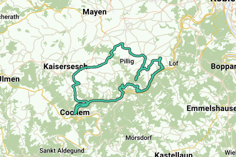 Vanuit Klotten klim je weg uit het Moezeldal de Eifel in. Vervolgens fiets je over de hoogvlakten van de Eifel, grotendeels over Kreisstraßen. Het is even kort klimmen bij de doorgang van de Pommerbach, en later bij de doorgang van de Elzbach. Je komt nu in de Maifeld, de golvende hoogvlakte waar graan wordt verbouwd. In Mertloch fiets je over het vrijliggende fietspad over een voormalige spoorlijn en zo kom je in Munstermaifeld. Nu daal je af naar wederom de Elzbach (doodlopend) om bij het sprookjesachtige Kasteel Eltz te belanden. Daarna moet je dus ook weer wegklimmen uit het Elzbachdal over dezelfde weg als dat je gekomen bent. Je daalt af naar de Moezel via het mooie Schrumpfbachdal. Je zou ook al eerder af kunnen dalen langs plaatsje Lasserg naar het Moezeldal, dan is de afdaling vrij kort (want dat gaat 2 km lang met bijna 15% naar beneden), de route wordt dan zo'n 6 km korter. In het Moezeldal aangekomen volg je het fietspad langs de Bundesstraße in het Moezeldal tot aan Cochem, onderbroken door een beklimming weg uit het Moezeldal (de Müdenerberg). In de route ligt nog een zeer kort heen-en-weertje naar burcht Bischofstein (kort klimmetje) maar die kun je natuurlijk uit de route laten.