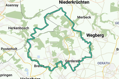 Na het oversteken van de B221, fiets je door de bossen van de Wassenberger Meinweg en langs golfbaan Schmitzhof. Na een kort stukje asfalt duik je de bossen in van de Klinkumer Busch, en vervolgens fiets je door de velden rond dorpje Klinkum (dat is hoofdzakelijk over asfalt). Vervolgens fiets je langs Slot Tüschenbroich en door het Tüschenbroicher Wald (gravel). Je fietst daarna door de velden/akkers ten oosten van Gerderhahn, met een kleiner aandeel gravelwegen.