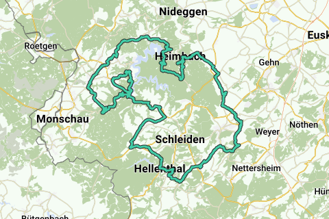 Einruhr - Eicherscheid - Simmerath - Strauch - Schmidt - Hasenfeld - Heimbach - Hergarten - Bergbuir - Bleibuir - Wielspütz - Voibel - Wallentahl - Scheven - Döttel - Keldenich - Steinfeld -Diefenbach - Sistig - Wollenberg - Reiffenscheid - Hönningen - Hellenthal - Schöneseiffen - Dreiborn - Morsbach - Einruhr.