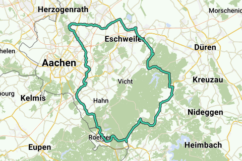 Rijd je benen los en geniet van het landschap in Eschweiler. Maak gebruik van het openbaar vervoer om deze route te bereiken. Hou je van een stevige helling? Dan is deze route zeker jouw ding. Geniet tijdens deze route van de geur van bomen. Regenweer? Oliejekker aan en stop je laarzen in je fietstas. Heerlijk dagje bos (Slag om het Hürtgenwald). Weinig toe te voegen aan deze uitstekende route.