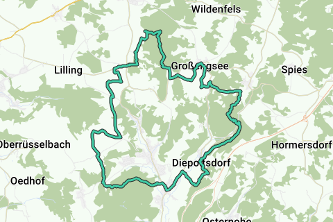 Een heuvelachtige route door Simmelsdorf. De route gaat gedeeltelijk over onverharde paden. Weinig kans dat u langs deze route veel auto's ziet. Bewonder zeker ook de bezienswaardigheden langs deze route (o.a. Burgstall Hienberg). Al met al, een mooie route! Neem de tijd voor deze route.