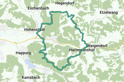 Over bergen en dalen verken je Pommelsbrunn. Weinig kans dat je langs deze route veel auto’s zult zien. Mooie uitzichten krijg je gratis cadeau! Deze route gaat over onverharde paden. Bij droog weer zijn ze echter in uitstekende staat. Een bezienswaardigheid langs deze route moet je zeker gezien hebben: kasteelruïne Hartmannshof. De mooie paden wisselen elkaar in snel tempo af.