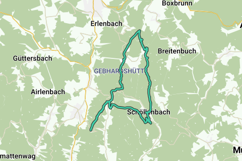 De start is vanaf de parkeerplaats op de Sensbacher Höhe. We gaan eerst in de richting van Reußenkreuz. Kort daarvoor slaan we echter rechtsaf en volgen we het hoogtepad tot de afdaling naar Schöllenbach. Bij de Quellkirche Schöllenbach vullen we onze drinkflessen bij en rijden dan naar de Eutersee. Na een korte rust gaan we verder en switchen we van dalzijde en rijden we de hele Eutergrund omhoog. Bij de Eutermühle gaan we vervolgens rechts omhoog naar het verbindingspad van Würzberg naar het Bullauer Bild. Nu verder via Gebhardshütte en het Reußenkreuz terug naar het vertrekpunt. #noebike