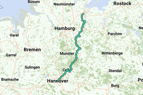 Pelgrimsroute voor mountainbikes tussen Lubbeck en Hannover. De volgende steden liggen op de route: Lubbeck, Lüneberg, Celle, Großburgwedel en Hannover.