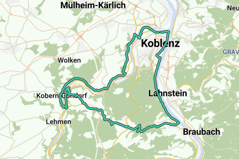 Vanuit Koblenz volgen we de moesel tot Kobern-Gondorf. Steken de heuvel over naar Waldech en dalen af tot Rheins en volgen de rijn tot Koblenz