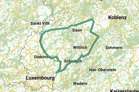 Rondrit door de Eifel waarin onder andere Trier, Cochem, Gerolstein en Prüm wordt aangedaan. Uitgangspunt is Hotel Daytona in Dasburg (lengte ca. 395 km.)