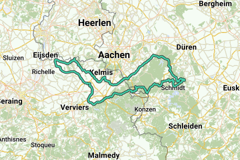 Teuven – Remersdaal – Hombourg – Montzen – Busch – Lontzen – Astenet – Walhorn – Belven – Raeren – Sief – Schmithof – Walheim – Hahn – Breinig – Breinigerberg – Mausbach – Gressenich – Schevenhütte – Groshau – Kleinhau – Brandenberg – Bergstein – Zerkall – Brück – Geisief (Schmidt) – Froitscheidt – Mausbach – Vossenack – Simonskall – Rollesbroich – Lammersdorf – Waldsiedlung – Hahnerstrase – Dreilägerbachtalsperre – Roetgen – Petergensfeld – richting Eupen – Membach – Goé – Dolhain – Honthem – Heggen – Lanceaumont – Welkenraedt – Ruyff – Henri-Chapelle – Merckhof – Hagelstein – Warsage – S.G.V. – S.M.V. – De Plank – Teuven.