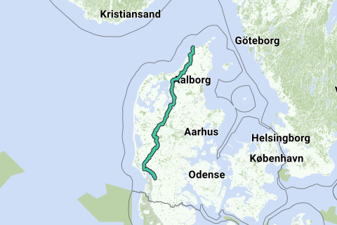 Deze route gaat buiten de grote wegen om redelijk rechtsstreeks door Denemarken naar het veer naar o.a. Cristiaansand