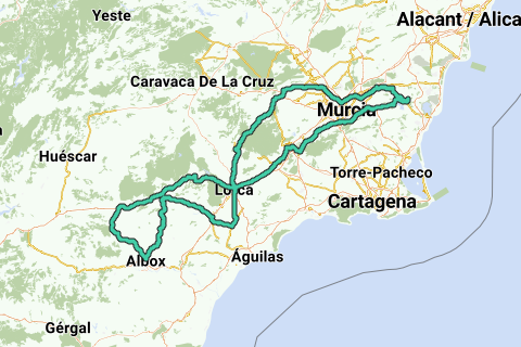<p><a class="routeYou_embed" href="https://app.routeyou.com/nl-es/route/view/11211556?utm_source=embed&utm_medium=article&utm_campaign=routeshare&navigation=external" title="Orihuela Velez Rubio Albox Orihuela 440km - RouteYou" target="_blank"><img src="https://image.routeyou.com/embed/route/960x670/11211556-nl@2x.png" style="width: 100%; height: auto;" alt="Orihuela Velez Rubio Albox Orihuela 440km"></a></p>
