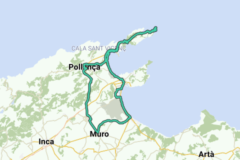 Vanuit Pollença fiets je door de rustige dorpjes Sa Pobla en Muro 🌾, bekend om hun landbouwgrond en landelijke uitzichten, naar Can Picafort 🌊. Hier geniet je van het uitzicht op zee en de kustlijn.