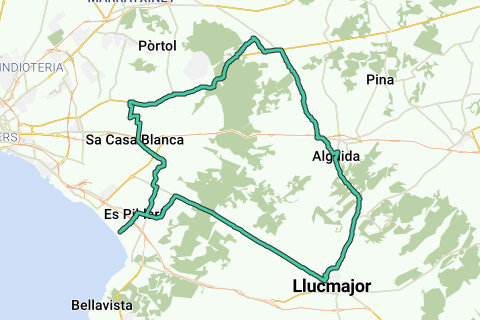 Binnendoor naar Santa Eugenia, dan ri Randa, evt bij afslag Randa ccolletje op (cruz de randa, heen en terug 11 km extra), dan via Lucmajor terug naar El Arenal