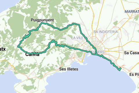 Van Can Pastilla, niet ver van de luchthaven van Palma, naar Galilea. Dit dorpje in het binnenland ligt verscholen in de Tramuntana tussen Es Capdella en Puigpunyent. Een paar stevige klimmen zijn je deel, Vanuit Palma klim je naar de Sa Creu, om daarna af te dalen naar Calvia voor een kopje koffie. Na Es Capdella klim je opnieuw serieus to Galilea, de col de Galilea. Afdalen daarna tot Palma en langs het fietspad aan zee terug. Korte maar pittige rit.