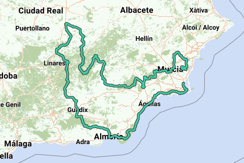 Los Alcazares-Cartagena-Aguilas-Almeria-Guadix-Ubeda-Valdepenas-Cazorla-Galera-Lorca-Murcia-San Miguel de Salinas