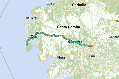 Pelgrimsroute voor het wandelen tussen Fisterra en Santiago de Compostella. De volgende steden liggen op de route: Fisterra en Santiago de Compostella.