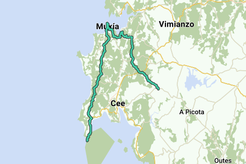 Pelgrimsroute voor het wandelen tussen Fisterra en O Logoso. De volgende steden liggen op de route: Fisterra, Muxia en O Logoso.