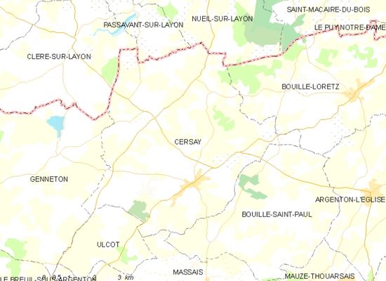 De onderstaande kaart toont de ligging van Cersay met de belangrijkste infrastructuur en aangrenzende gemeenten.