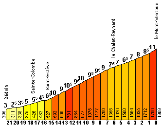 De berg is vooral bekend van wieleretappes in onder andere de Ronde van Frankrijk. De beklimming vanuit Bédoin is erg zwaar door de lengte van de klim (21 km), het gemiddelde stijgingspercentage (7,6 %) en de zomerse temperaturen in Zuid-Frankrijk. In totaal zijn er drie beklimmingen met een racefiets mogelijk. De klim werd de wielrenner Tom Simpson in 1967 fataal door een combinatie van doping, alcohol en de hitte.