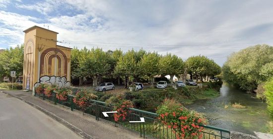 Over de brug voorbij het ietwat rare gebouw bevindt zich een parking.
