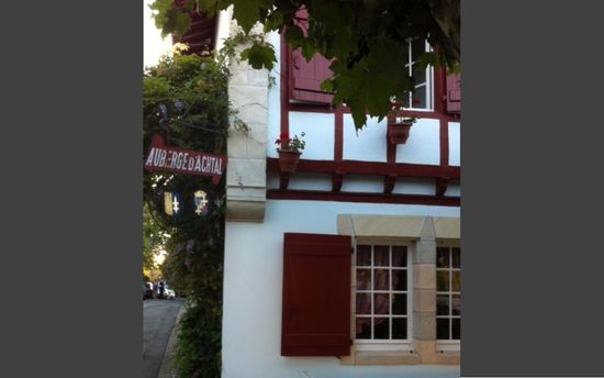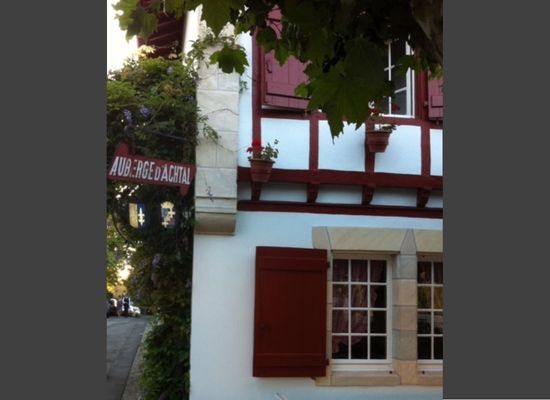 Aan de voet van de kerk en tegenover de prachtige roze fronton van Arcangues heeft de Auberge Achtal een zeer aangenaam schaduwrijk terras waar het goed toeven is.