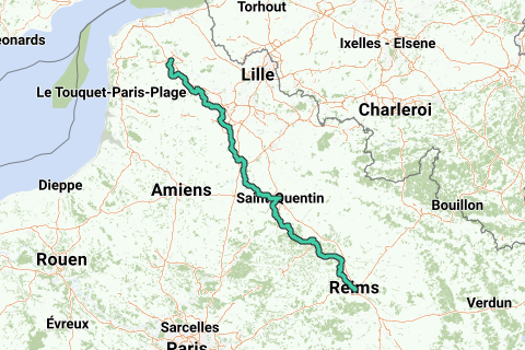 C'est l'itinéraire complet de la Via Francigena en France. La Via Francigena va de Canterbury (GB) à Rome (I). En France, ce chemin de pèlerinage a été désigné GR 145. Vous pouvez diviser l'itinéraire en itinéraires gérables avec un programme tel que Garmin Base Camp ou Mapsource. Cette vue d'ensemble peut être utile car, d'après mon expérience, la signalisation est (pour l'instant) insuffisante dans certains départements.