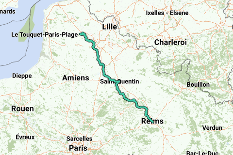 C'est l'itinéraire complet de la Via Francigena en France. La Via Francigena va de Canterbury (GB) à Rome (I). En France, ce chemin de pèlerinage a été désigné GR 145. Vous pouvez diviser l'itinéraire en itinéraires gérables avec un programme tel que Garmin Base Camp ou Mapsource. Cette vue d'ensemble peut être utile car, d'après mon expérience, la signalisation est (pour l'instant) insuffisante dans certains départements.