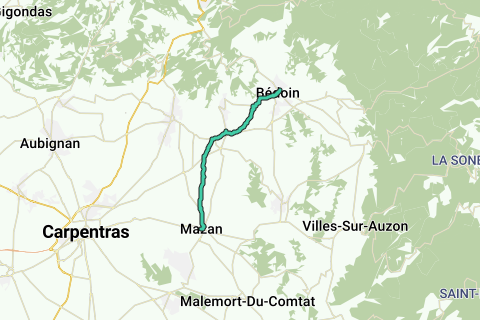 <p><a class="routeYou_embed" href="https://app.routeyou.com/nl-fr/route/view/1162281?utm_source=embed&utm_medium=article&utm_campaign=routeshare&navigation=external" title="mazan - bedoin - RouteYou" target="_blank"><img src="https://image.routeyou.com/embed/route/960x670/1162281-nl@2x.png" style="width: 100%; height: auto;" alt="mazan - bedoin"></a></p>