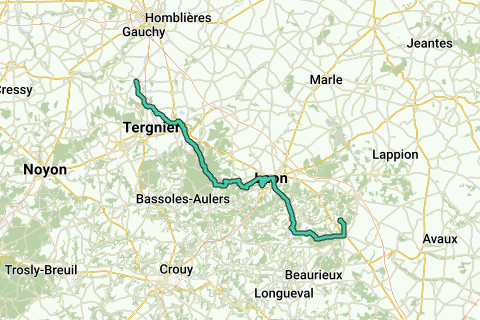 Onderdak in: La Fère, Cessieres, Molinchart, Laon, Martigny, Courpierre, Neuville sur Ailette, Corbeny (zie POI’s en waypoints op de kaart)