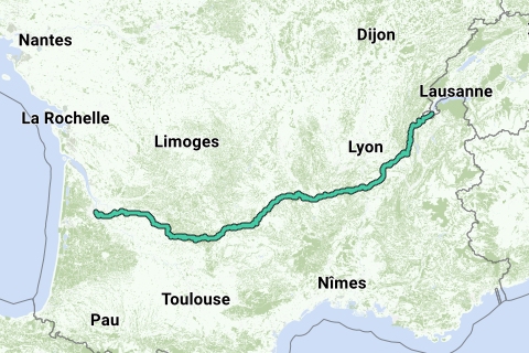 Overzicht van de volledige Midden Frankrijk route van de Europafietsers. Deze versie van de route is niet geschikt voor fietsnavigatie. Raadpleeg daarvoor de deelsegementen van de route in de groep Midden Frankrijk Fietsroute.
