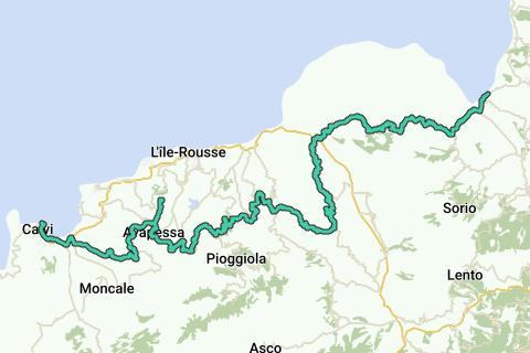 Je fietst van Saint-Florent naar Calvi. De route voert je eerst langs de rand van Désert des Agriates, een desolate vlakte met laag struikgewas. Je beklimt hier de Bocca di Vezzu (ook bekend als Bocca di Petraiolu). Vervolgens fiets je naar de noordrand van het centrale bergland (naar zo'n 650 meter hoogte) over zeer rustige wegen. De lange klim gaat tot Novella over prima asfalt maar vanaf Novella over matig asfalt (afgesleten toplaag, geldt ook voor de afdaling (totaal 6 km matig wegdek)). Vervolgens beklim je de Col de San Colombano. En je passeert schattige bergdorpjes als Speloncato en Occhiatana.