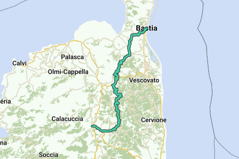 Vanuit Corte fiets je richting het oosten en vervolgens richting noorden: je beklimt Col de Sainte Antoine. De afdaling van deze col brengt je in Castagniccia, een gedeelte van Corsica met vele (tamme) kastanjebossen (de kastanjebomen staan in bloei in de maand mei). Dit gedeelte van Corsica kent ontzettend veel smalle weggetjes (vroeger was dit de rijkste regio op Corsica), ontelbare haarspeldbochten, en vele (zeer kleine) dorpjes (meer dan elders op Corisca). Je beklimt de Poggio en passeert kleine dorpjes als San Lorenzo (na San Lorenzo volgt een prachtig panoramapunt), Saliceto, Castineta, Morosaglia. Uiteindelijk daal je af naar de vallei van rivier Le Golo, en volg je anderhalve kilometer lang de drukke T20. Je hebt inmiddels de Castagniccia verlaten en je klimt snel weer weg uit de vallei van Le Golo via de Col de Bigorno. Vervolgens daalt de route af naar weer één van de schattige dorpjes die je al zoveel bent gepasseerd, Oletta. Je beklimt vervolgens de zuidwestelijke kant van Col de Teghime (de laatste 7 km), en vanaf de top heb je een schitterend panorama naar beide kanten van het schiereiland (Cap Corse). Dan volgt de afdaling naar de drukke stad Bastia. De laatste 7 km gaat door de voorstadjes van Bastia en door Bastia zelf.