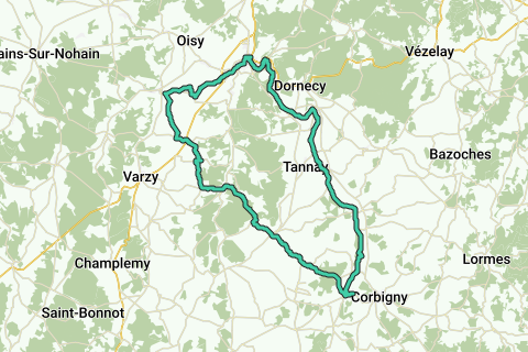 Route vanaf het gastenhuis "Le Clos de Chitry" in Chitry-les-Mines langs autovrije wegen naar Clamecy en terug via het Canal de Nivernais.