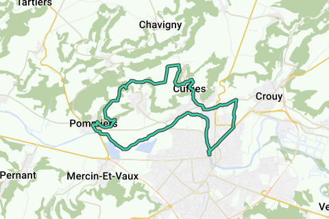 De belangrijkste attractie van deze route ligt in de talrijke uitzichten op Soissons, de bekkens van Pasly en Cuffies, evenals de vallei van de Aisne. We beginnen zachtjes op de vaarwegen, voordat we omhoog klimmen naar het kalkstenen plateau, dat enkele curiositeiten herbergt, zoals het oude Oppidum van Noviodunum.