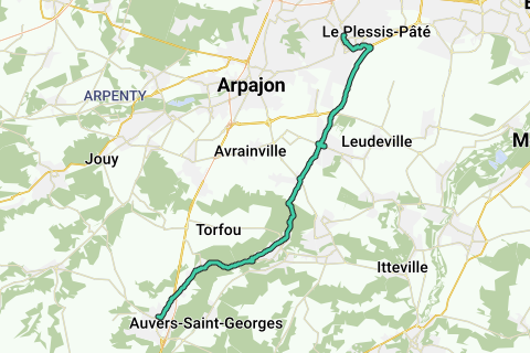 Traject van Brétigny-sur-Orge naar Etréchy via de departementale wegen.