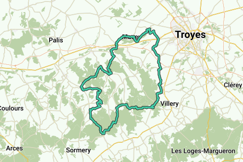 Fietsroute van 83km, 1000 hoogtemeters, vanuit Montgueux in het westen van Troyes. De route is geschikt voor racefiets en e-bike. Onderweg zijn er enkele pittige hellingen. Bij de startlocatie is een parking. Vanuit het oude stadsgedeelte van Troyes kan je met de fiets via de niet zo drukke D53 in Torvilliers geraken, om vandaaruit de route te volgen. De totale afstand zal dan ongeveer 100km bedragen. Montgueux is een grand cru-gemeente van de Appellation contrôlée champagne, in het westen van Troyes. Verder heb je in de nabije buurt geen champagne. Om af te sluiten kan je champagne proeven. Zelf gingen we langs deze route in Montgueux bij Eric Therrey degusteren. Na een kleine helling, start je direct met een afdaling tussen de wijngaarden. Er volgt een vlakke aanloop gaat de route via een heuvelachtig gebied met heel wat bossen en graanvelden. Je passeert enkele kleine dorpjes. De route gaat via volgende wegen en dorpjes: Montgueux - D91, D141, D94, D53 - Torvilliers - D141, D94 - Laines-aux-Bois - D94 - Bouilly - D72 - Sommeval - D72, D23, DD72, D111, D374, D151 - Vosnon - D22 - Nogent-en-Othe - D22 (eventueel omweg via Saint-Mards-en-Othe), D374, D15, D121 - Villemoiron-en-Othe - D374, D139 - Vaugeley - D139, D23 - Chennegy - D15 - Bucey-en-Othe - D34, D15 - Fontvannes - D660, D15 - Macey - D15B - Grange-au-Rez - D91 - Montgueux Verkortingen zijn eenvoudig in de route in te bouwen.