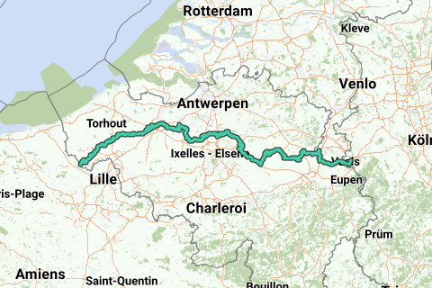 2. Het verder tracee doorheenVlaanderen, Wallonië en Duitsland tot Aken, ongeveer km.