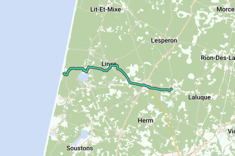 Dit is de perfecte route voor natuurliefhebbers! Deze 31,3 km lange tocht vlakbij de Ludo-médiathèque neemt je mee door de prachtige Landes de Gascogne. Met een gematigde stijging van 255 meter en een volledig verharde weg, kun je heerlijk ontspannen fietsen. Onderweg kun je even stoppen bij Cinéma Le Kursaal of relaxen aan het Plage du Lac in Vielle. Het grootste deel van de route is rustig en ver weg van verkeer, zodat je volop kunt genieten van deze groene omgeving.