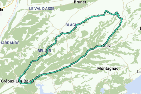 Start rond punt centrum Greoux. Enkele middelmatige hellingen. Moeilijkheid: ** Mooie route met prachtige panorama's tot aan Ventoux. Mooie lavendelvelden.